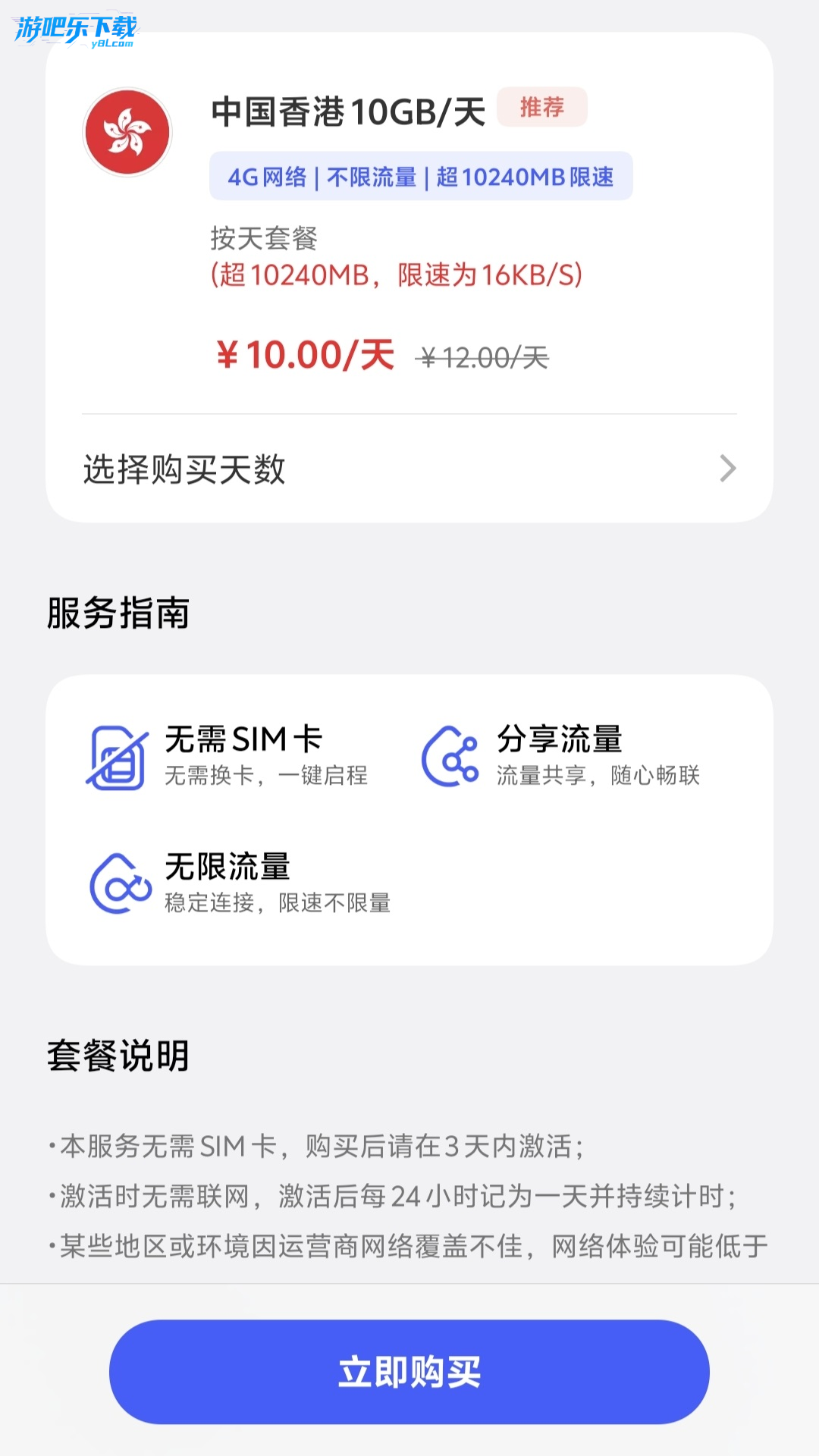 便捷性:流量商店通过虚拟SIM卡技术,无需更换实体卡即可在境外上网。购买套餐后,即使在无网络环境下也能完成购买(使用上限为100MB,时长不超过30分钟),启用后即可使用。