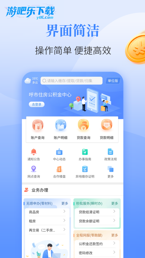 4、业务办理页面拥有管理个人账户、公积金提取、贷 款管理、异地转入接续功能。