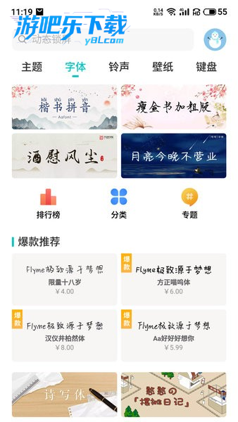 进入主题美化 > 字体,浏览并下载喜欢的字体