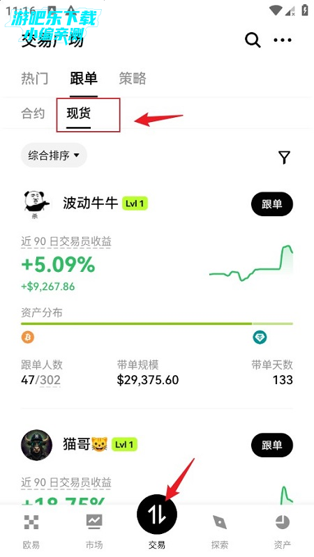 1、进入欧易APP主界面,在首页中点击页面下方【交易】- 选择现货