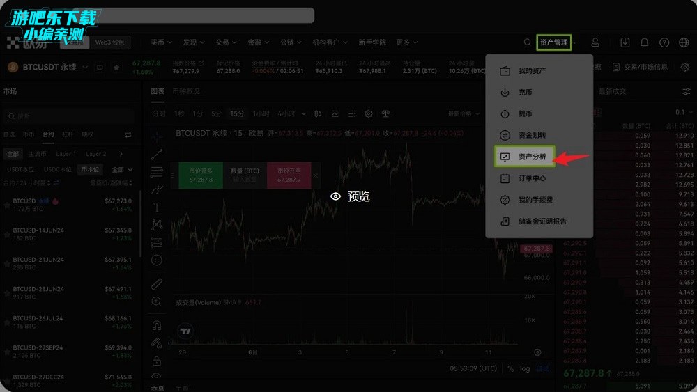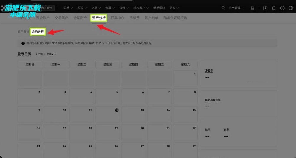 1、在交易页面中点选【资产管理】-【资产分析】-【合约分析】
