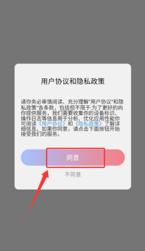 1、在用户协议与隐私政策弹窗中点击"同意",进入应用首页。