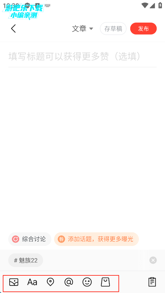 3、在屏幕的最下方拥有许多的功能,比如上传相片,字体的调整,地点的添加等等功能。