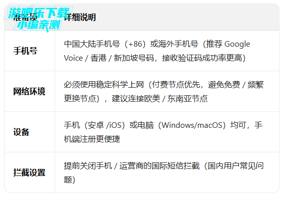 准备+86手机号+稳定网络 → 下载Telegram → 启动注册 → 选择+86输入手机号 → 短信/语音验证 → 设置个人信息 → 绑定邮箱+开启两步验证 → 完成注册