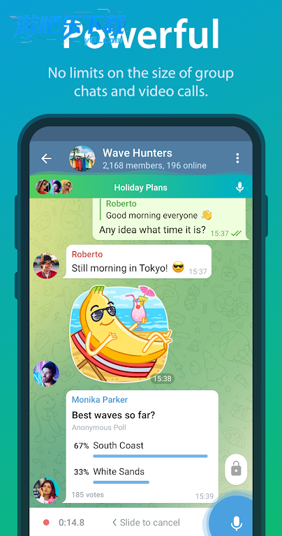 Telegram(中文名电报)是一款全球流行的跨平台开源即时通讯应用,以安全加密、高效传输、功能丰富、隐私保护为核心优势,支持多设备同步登录,满足个人沟通、社群运营、信息传播等多元需求,在全球拥有海量用户群体。支持单次发送最大 2GB 的文件,涵盖文档、图片、视频、音频等全格式,传输速度快且文件无压缩损耗,满足工作、生活中的大文件分享需求。