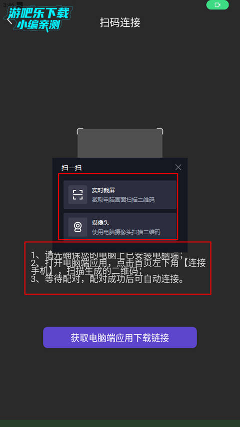 3、如果电脑端有app,可以点击电脑首页左下角“连接手机”,会生成一个连接二维码;手机扫描后配对成功即连接成功。