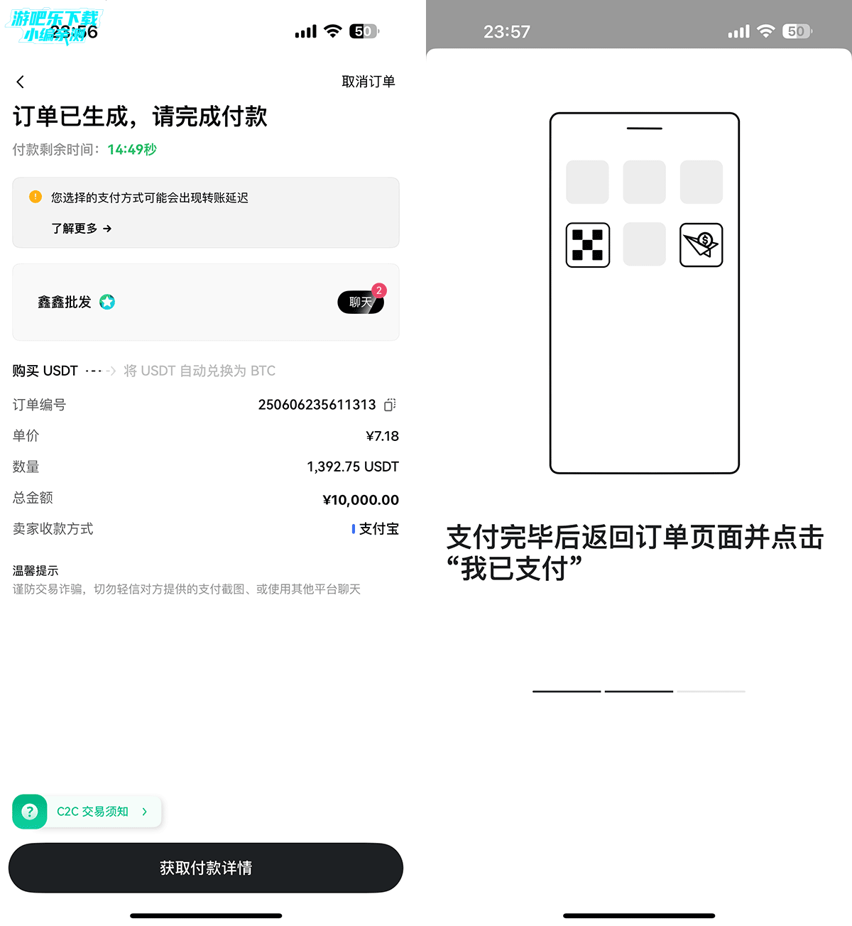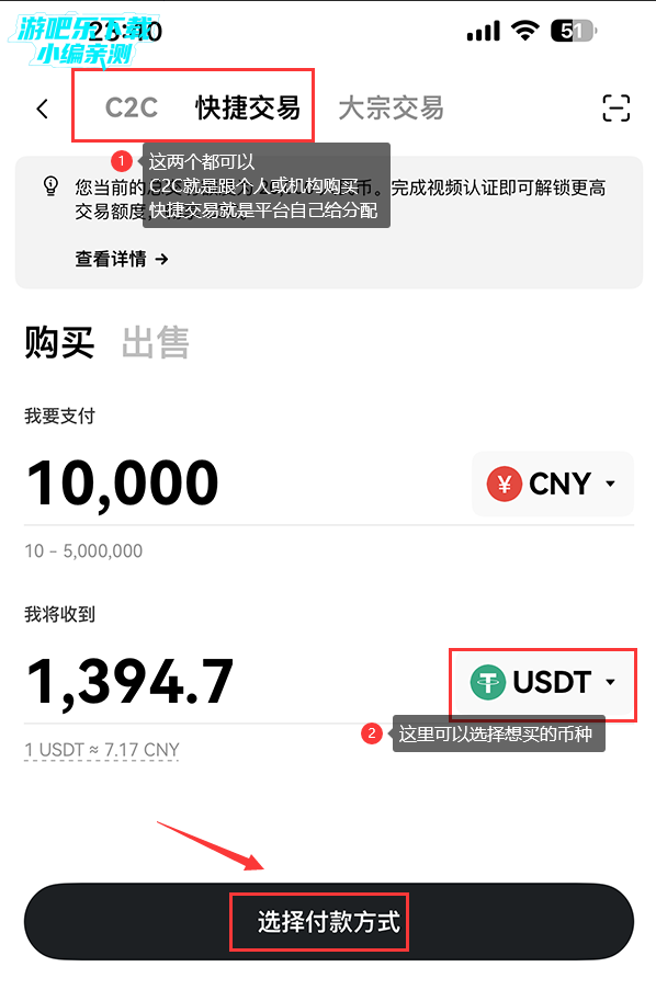 C2C交易分为自己选择C2C、快捷交易、大宗交易三种,一般新手可以使用快捷交易,这个是平台推荐一些比较靠谱的商家