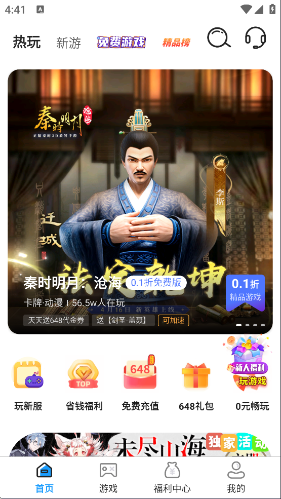 1、下载安装好0.01折手游盒子平台,运行软件并进入,可以看到有热游、新游、免费游戏、精品榜等等;