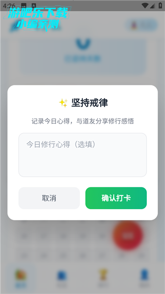 4.点击坚持戒律,输入今日修心的心得,点击确认打卡