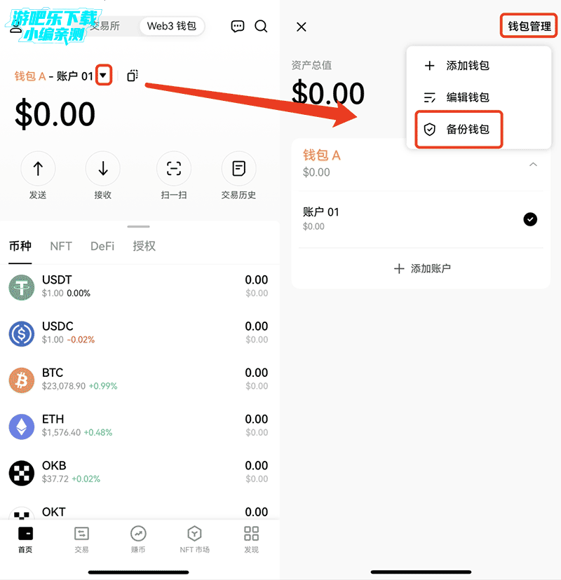 打开欧易 Web3 钱包,点击 ▼ > 钱包管理 > 备份钱包。