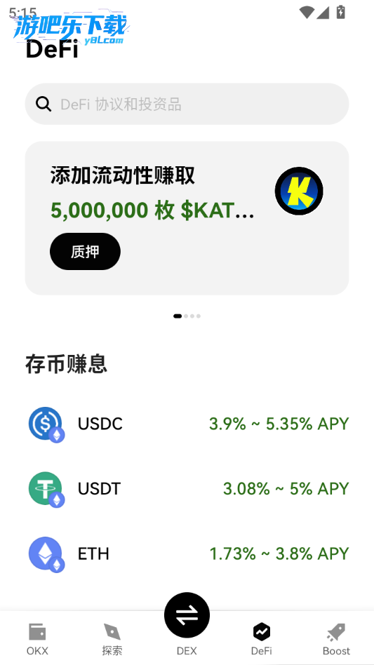 理财:在理财板块选择产品,按指引参与质押或挖矿。
