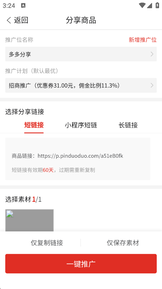 2、选择推广位后点击一键推广,然后将生成的链接分享给他人购买