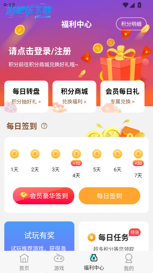 每日任务(如登录、游戏点评、分享等)可获取积分,积分可在积分商城兑换游戏专用券、礼包等资源。