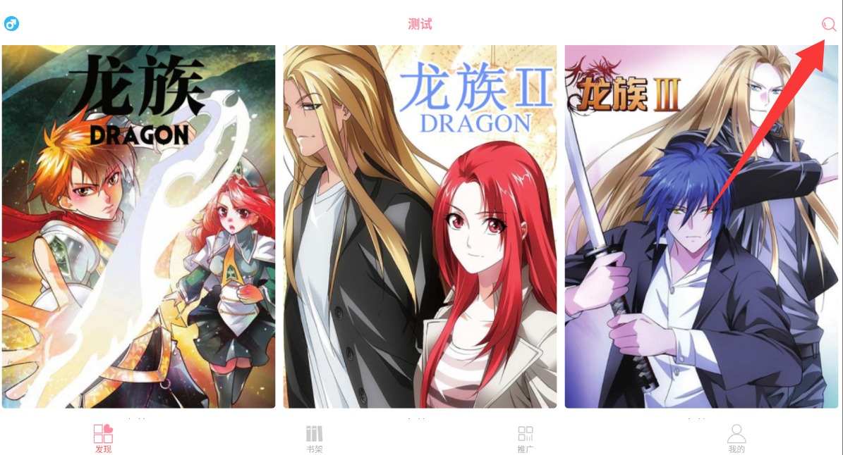 3、成功登录后进入APP首页,点击右上角搜索图标输入作品名称或关键词即可查找想要观看的漫画。