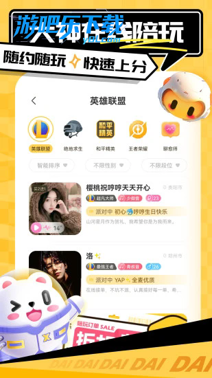 陪玩这一行业最近非常的火爆,很多单人玩家都喜欢在各大陪玩平台点上一两个陪玩小姐姐或者游戏大神和自己一起开黑,告别一个人孤独的打游戏,今天就为大家找来一些不错的手机找陪玩软件,不仅能线上,还能组局约到线下陪玩!