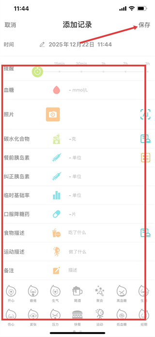 2、进入添加记录页面,填写血糖数值、时间及其他相关信息,点击保存。