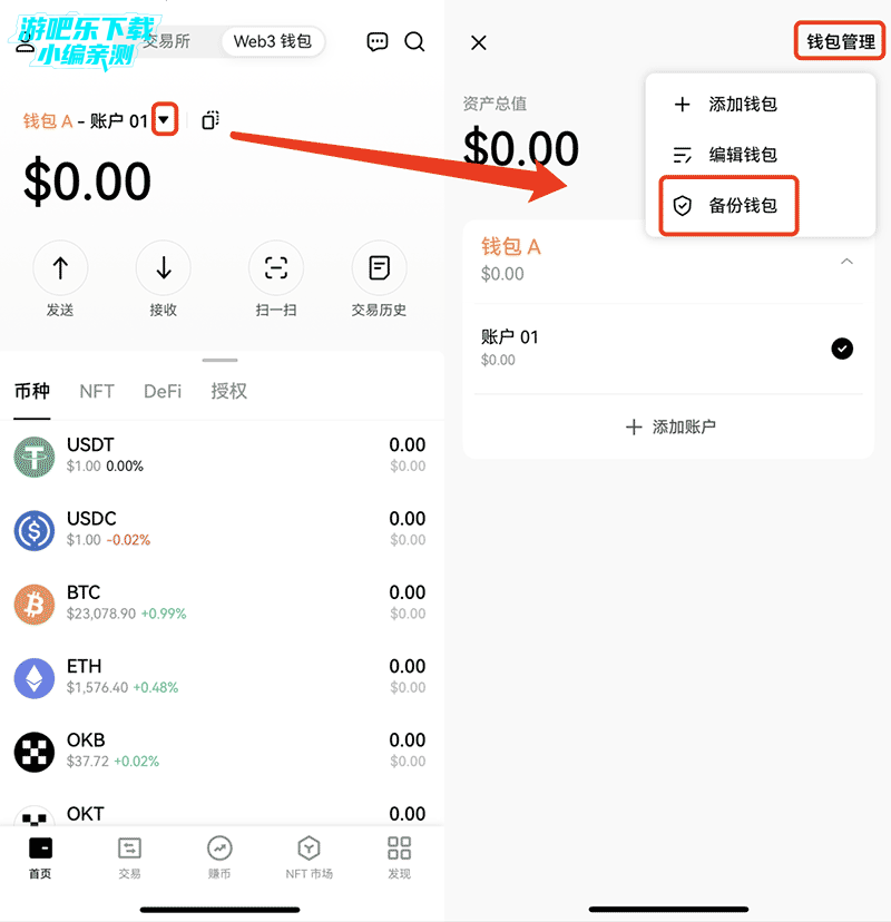 打开欧易 Web3 钱包,点击 ▼ > 钱包管理 > 备份钱包。