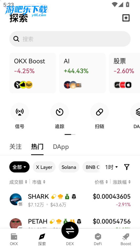下载进入oky钱包软件,点击中间交易