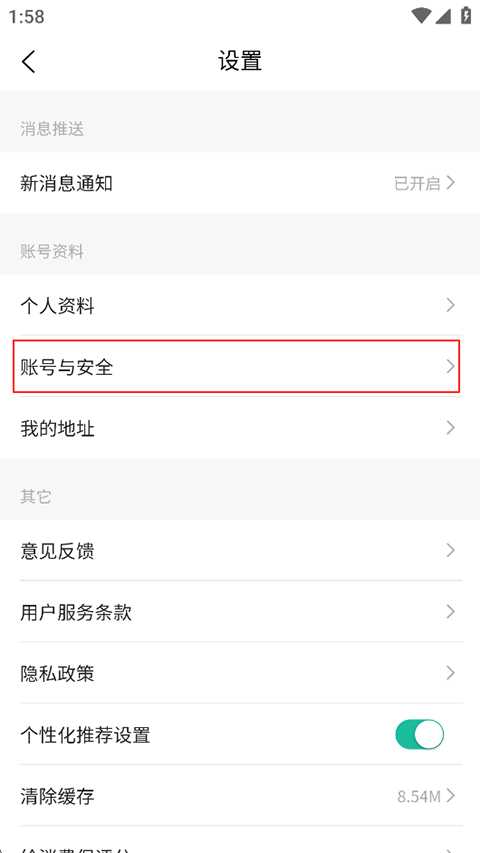 2、在设置页面找到并单击账号与安全;