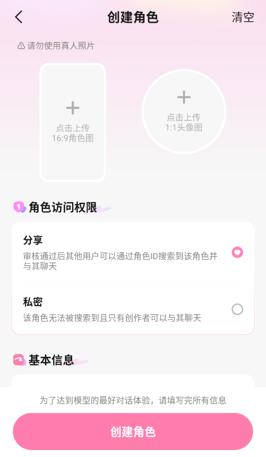 2、上传角色图、头像并编辑基本信息,选择是【分享】还是【私密】即可完成角色创建