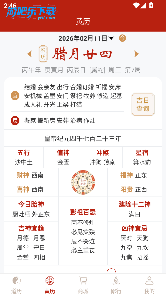 进入观吾道历软件,点击黄历