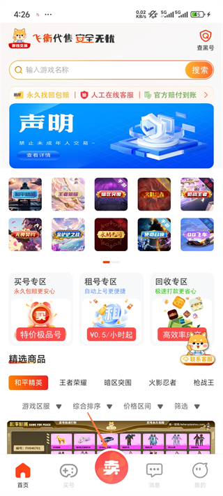 飞衡代售是河南飞衡网络科技有限公司开发的游戏账号交易平台,主打账号交易、租赁、回收、鉴定一站式服务,覆盖和平精英、王者荣耀、原神等上千款热门游戏,以终身找回包赔为核心卖点吸引用户。