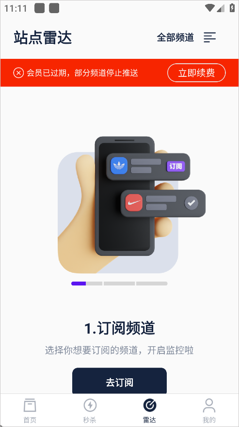 4、在站点雷达界面你可以订阅各种潮流发售平台的信息,实现全球实时监控潮流突袭和补货