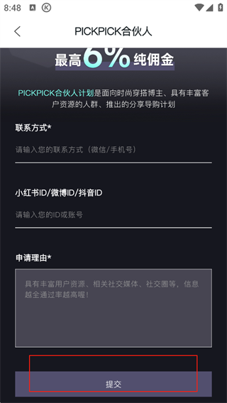 2、输入联系方式、小红书ID、微博ID、抖音ID,最后写一个申请理由点击提交