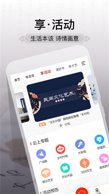 活动类型:汇聚全国性、区域性、地方性的全民艺术普及品牌活动,包括展览、比赛、节庆、民俗活动等文旅部