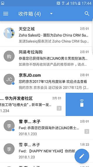 向左滑动邮件消息,快速进行删除、移动或归档操作。