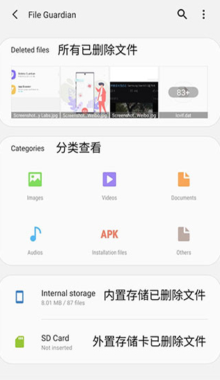 效果很像PC上的回收站功能,通过在后台持续全局监控手机存储变化,当有文件被删除,等情况时,将文件移到文件卫士里面统一管理。