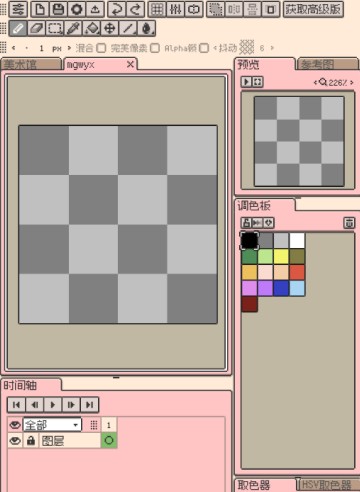 工具:画笔、喷枪、轮廓、渐变、模糊、选区(3 种)、形状、颜料桶、取色器,支持 Alpha 锁定、抖动(多种模板)、类索引色模式Resprite。