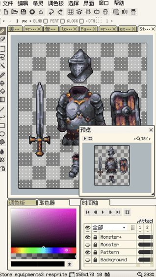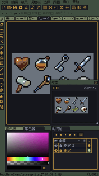 画布:最高 1080p 像素画布,支持 Pixel Perfect 像素级对齐Resprite。
