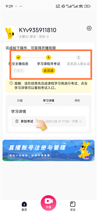 5、后续还需要学习课堂并考试,最后进行人脸识别就可以点击开直播啦