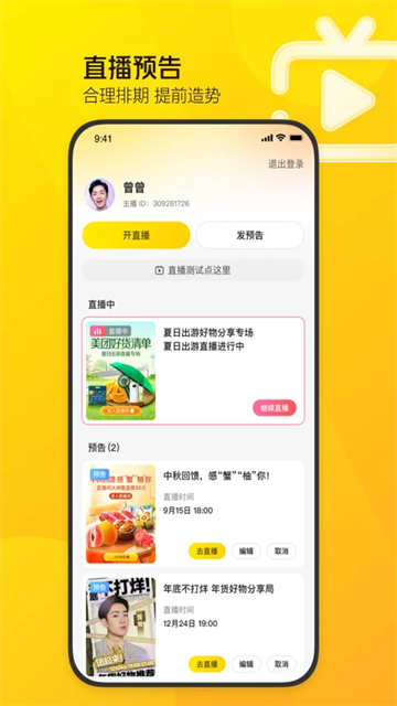 创建预告:设置直播时间、标题、封面,生成倒计时海报。