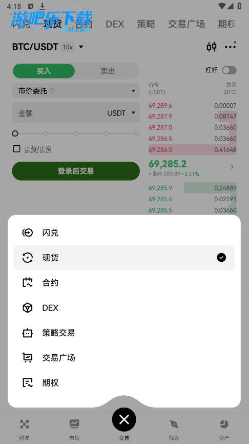 进入交易页面,选择交易对(如 BTC/USDT)