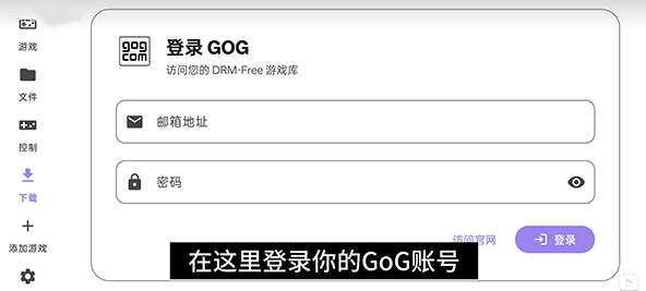1、进入软件后点击左边的【下载】按钮,登录你的GOG账号。