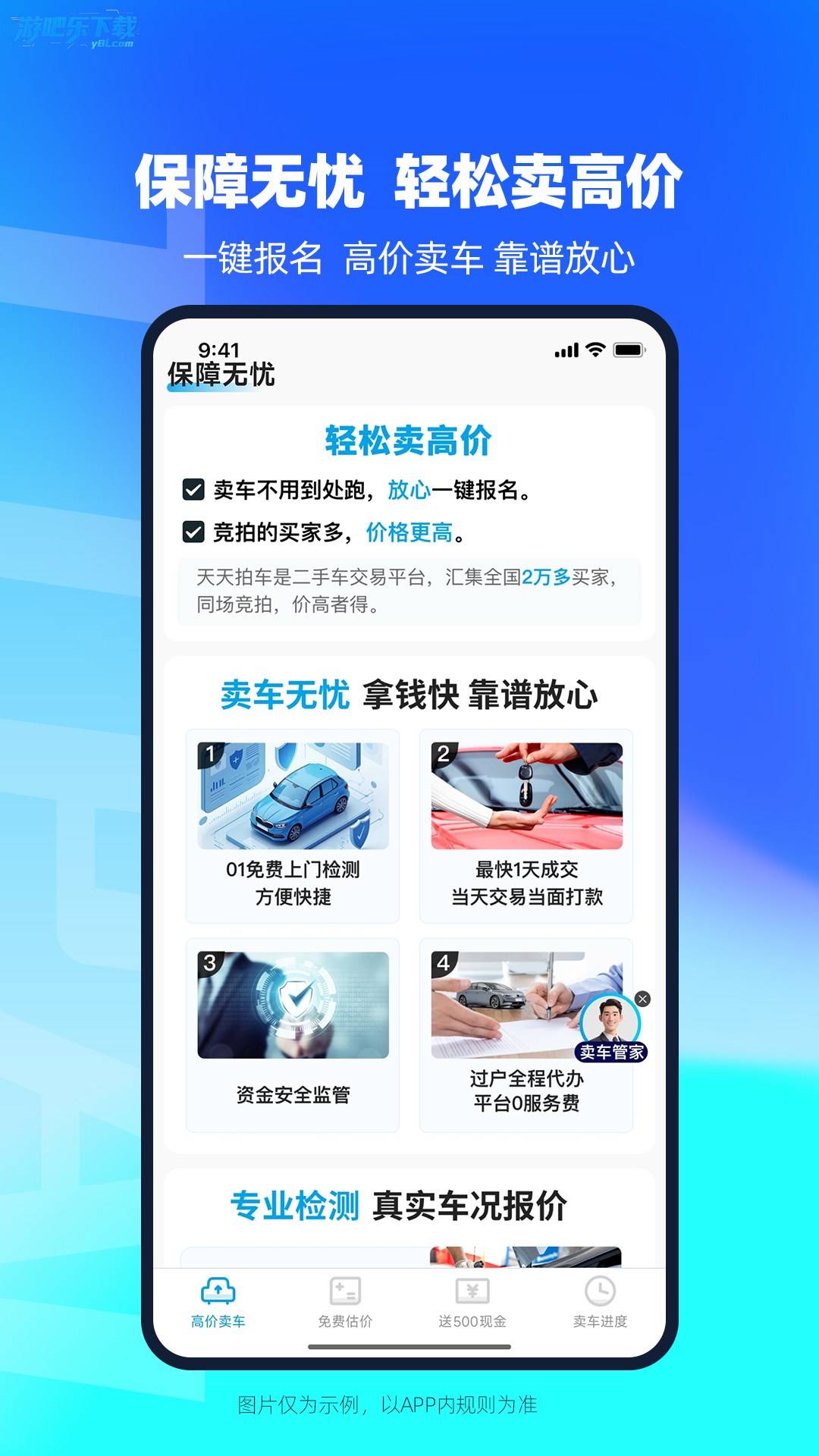 天天拍车app是二手车交易服务平台,有高价卖车、闪电交易、包办手续、全程免费等优势。能免费上门检测估价,卖主可实时了解交易进度,操作简便,功能丰富,保障交易安全,快来下载体验。