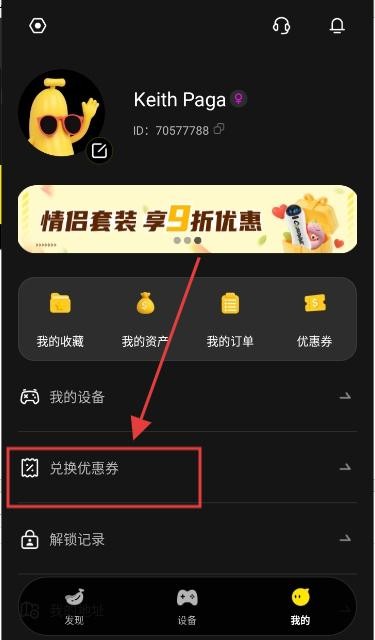 2、然后在我的页面中点击“兑换优惠券”选项。