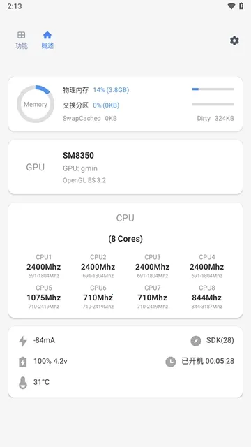 1. 功能丰富实用:能实时查看设备关键参数,精准掌握手机运行状况,支持帧率监测、多种模式及处理器自定义设置等,还可显示充电、耗电等详细曲线,一键释放内存,让手机始终流畅。