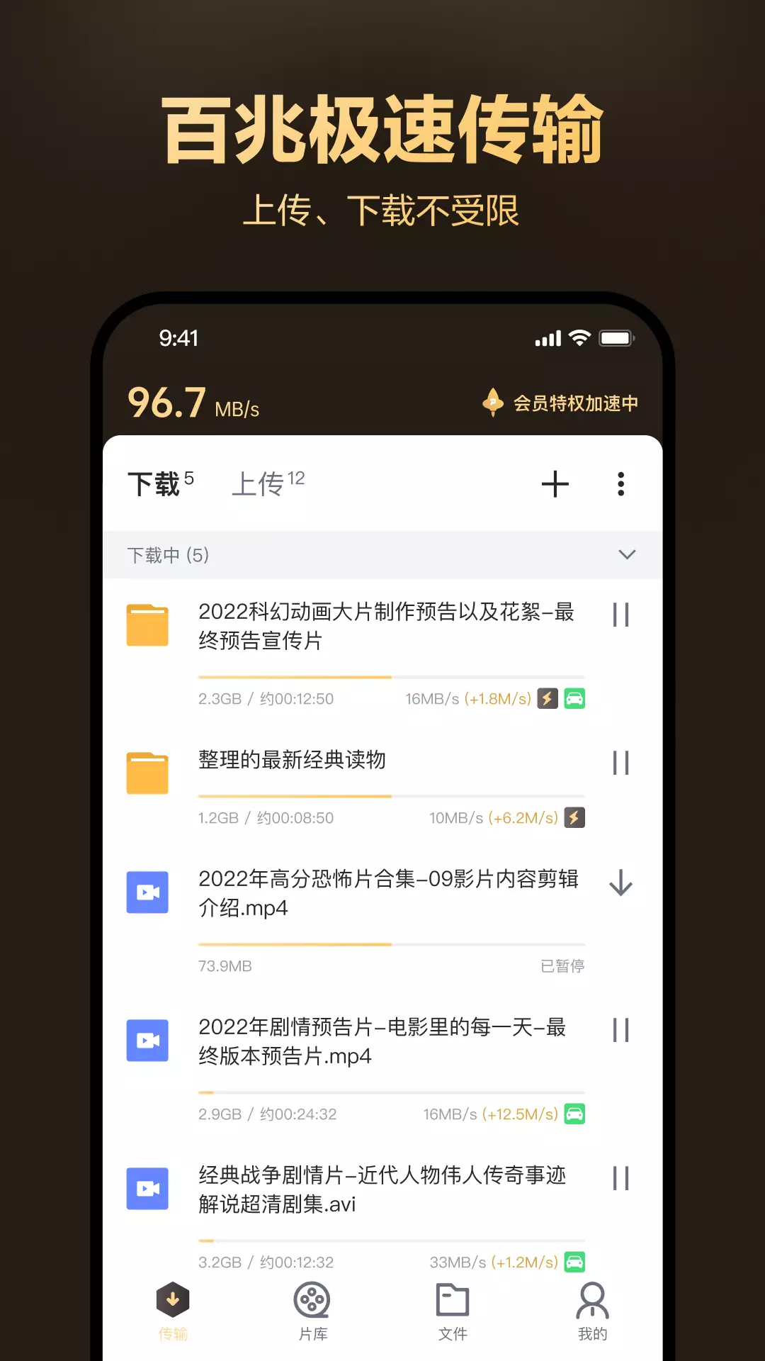 文件传输:手机 / 电脑 / 云盘文件高速上传下载,全程不限速,支持断点续传