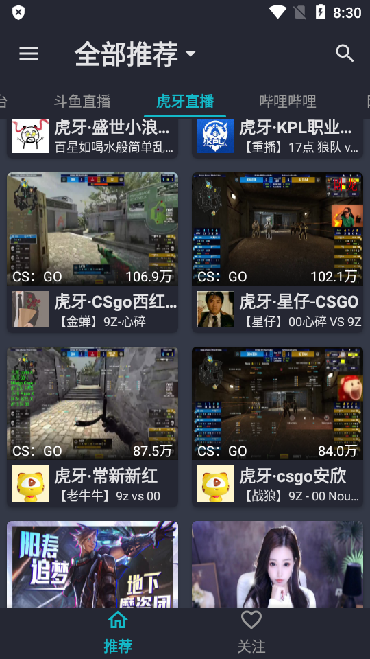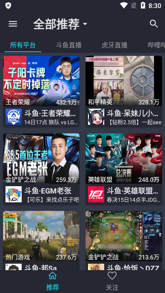 全平台覆盖:一键切换斗鱼、虎牙、B 站等平台内容,无需单独下载各平台 APP