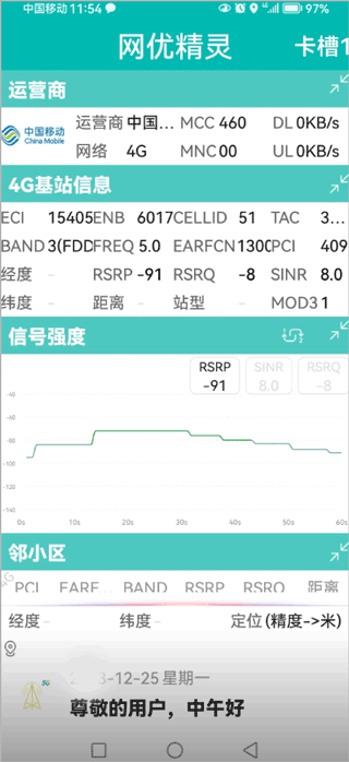 打开网优精灵App后,信号强度即可实时显示。强度数值可参考:极强信号(-50dBm至-80dBm)、良好信号(-75dBm至-85dBm)、一般信号(-85dBm至-95dBm)、较弱信号(-95dBm至-110dBm)、无服务范围(<-110dBm)。