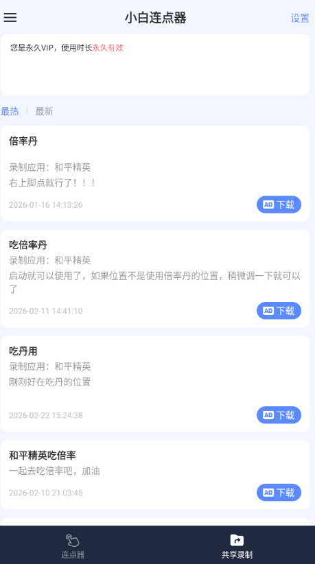 免费游戏连点器推荐软件聚合页面汇集了市面上几乎所有的免费游戏连点器,通过对比它们的优缺点,以及用户评价和体验,为用户提供了最权威、最专业的软件推荐服务。不仅可以让用户快速了解各个软件的功能、操作方式、使用体验等信息,还能帮助用户筛选出最适合自己使用的软件,并提供下载链接和使用指南,让用户轻松愉快地完成点击任务。游戏连点器怎么使用1、进入app以后,根据软件提示开启对应的权限2、您可以选择想要浏览的脚本,