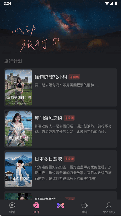 3、点击底部“旅行”图标,选择“趣看成都萌宝”等场景,跟随剧情提示与恋人互动。“朋友圈”板块可查看恋人动态并评论。