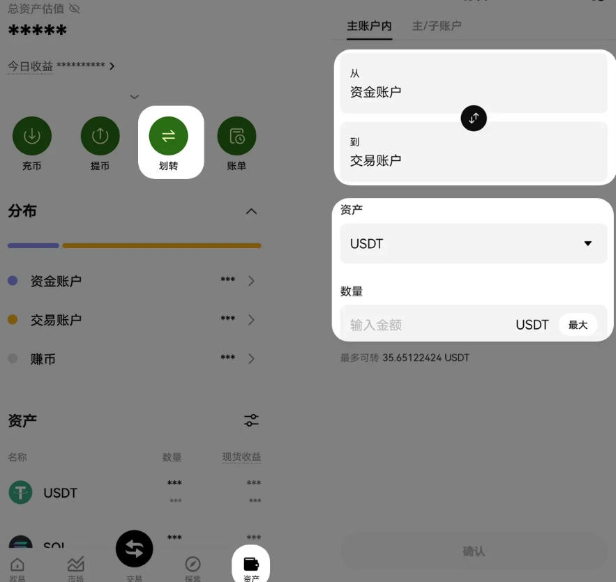进入 App 首页点击底部【资产】-【划转】,选择想要划转的币种,填写数量-【确认】,将所需进行交易的数字资产从【资金账户】划转到【交易账户】,即可体验更多交易。
