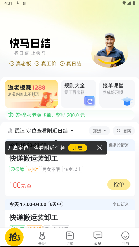 - 快马日结APP简直是蓝领工人的福音!找日结工作效率奇高,附近的好活优先推送,而且最棒的是工资当天结算,大大缓解了经济压力。操作界面也很直观,注册和抢单流程非常顺畅,真正做到了解决我们找活难的问题。