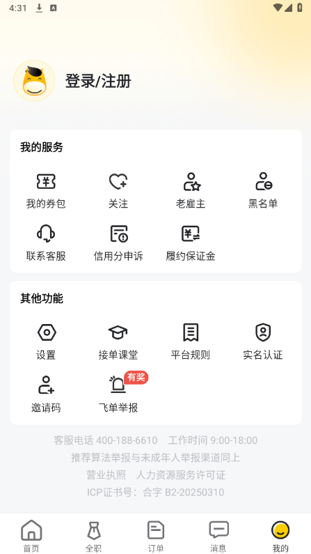 - 平台提供的岗位确实很多,智能匹配也挺方便。但有几个小点体验不佳:首先,抢单后还需要电话报名,如果能直接在APP内完成整个报名和确认流程会更高效。其次,客服电话号称24小时热线,但注明的工作时间却只有9:00-18:00,这让人在非工作时间遇到问题时会有些困惑,希望可以更明确或者真正实现24小时服务。