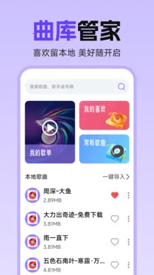 2. 本地管理便捷:可一键扫描导入手机本地歌曲,还能自定义创建专属歌单,自由分类打造个性化音乐清单,轻松管理本地音乐。