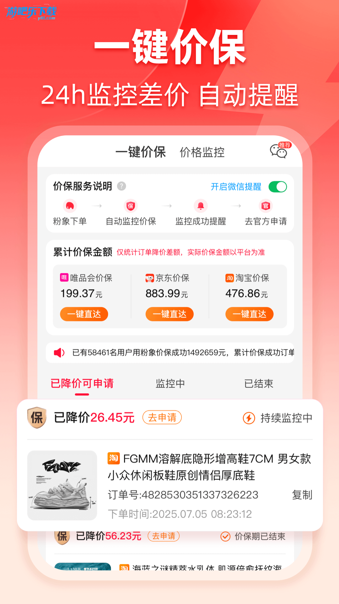 3、一键价保服务,24小时自动关注商品降价,差价及时到账。